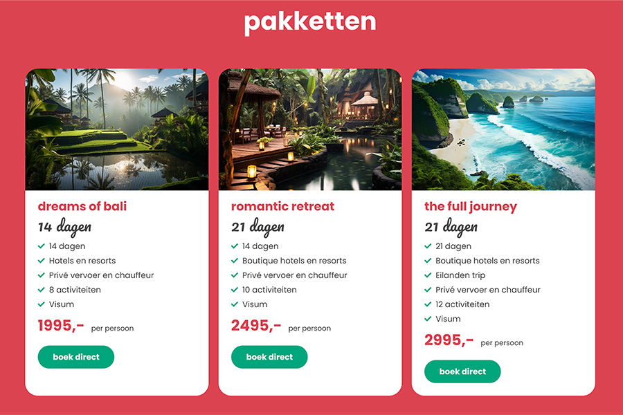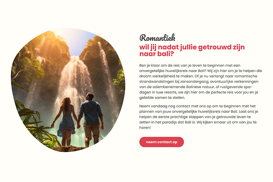 - Visuele verhalenvertelling: We hebben de website ontworpen met levendige beelden en romantische thema’s die de essentie van Bali en de unieke ervaringen die het biedt, vastleggen. Dit betrof het gebruik van prachtige, hoge-resolutie foto’s van Bali’s landschappen en culturele bezienswaardigheden.